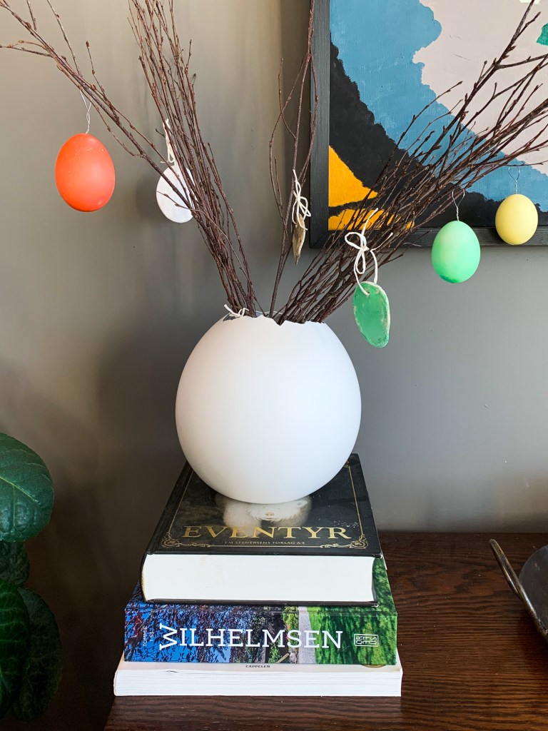 Obs! Eggene tåler ikke vann, så sett en liten tallerken i bunn, eller ha aluminiumsfolie på innsiden slik at vannet fra blomsten ikke renner ut. Pakk litt mose og noen kvister med gåsunger på toppen og du får en utrolig fin påskepynt.