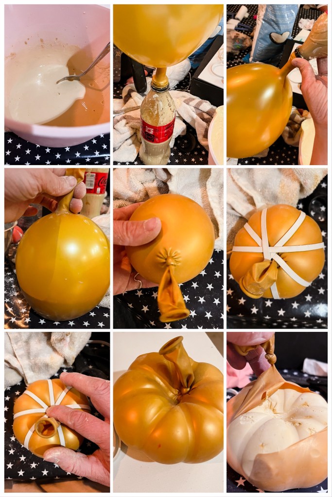 For å få den fine gresskarformen må du nå klemme ned i toppen, helt til gipsen har tørket. Det tar ca 5 minutter, avhengig av hvor mye den stivet før du tok på strikkene 🙂 Når gipsen har stivnet nok til at den holder formen, kan du slippe og la den stå til tørk